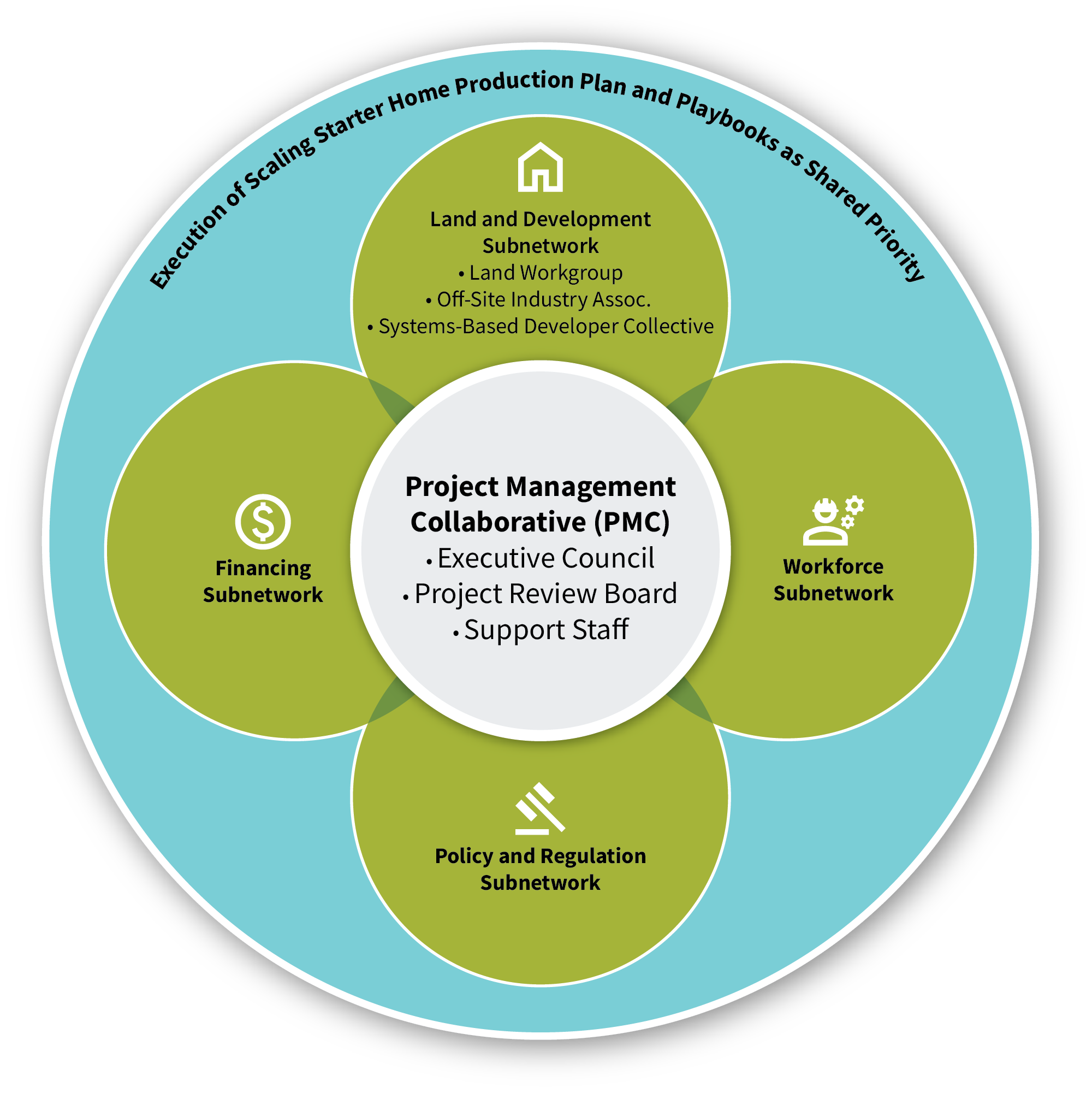 The first step is creation of a Project Management Collaborative (PMC), a temporary, multi-sector crisis task force to deliver the expertise, operational structure, funding, and collaboration critical to sustaining the Starter Home Plan’s momentum until the work is embedded in aligned organizations and agencies.